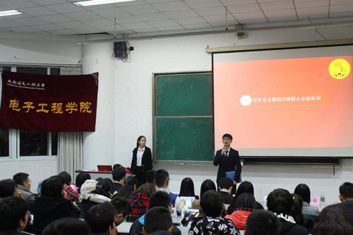 最后由学生会主席田川锋致大会结束词,对部长干事的工作给予肯定,表示大家在接下来的工作中要严格要求自己,希望所有的电子团学干部真正热爱电子,热爱学生会,只有爱才会付出,因为付出才会更爱!