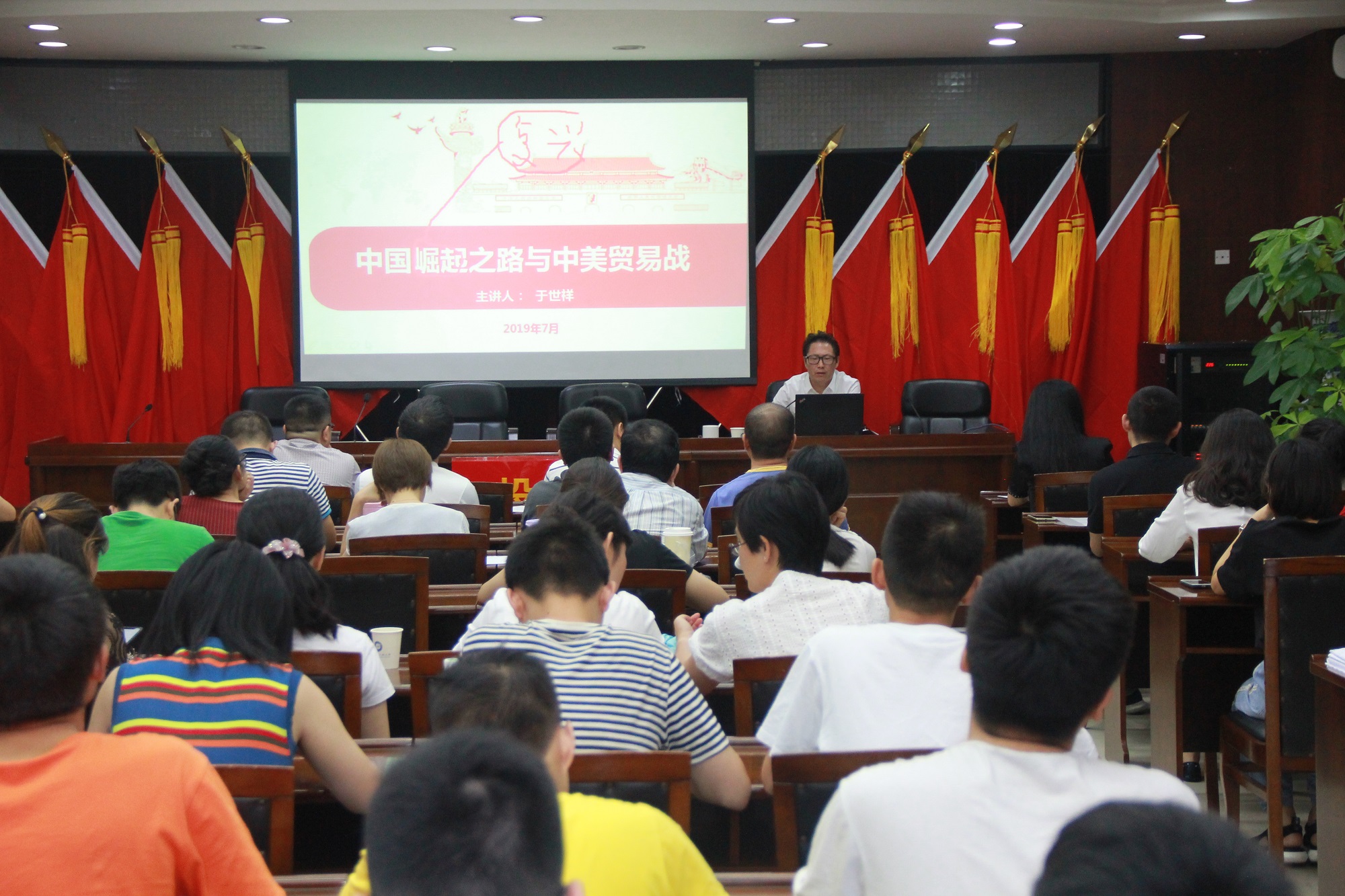 【本网讯】7月9日,副校长于世祥在行政楼一会议室为控制工程学院师生作了主题为“中国崛起之路与中美贸易战”的专题报告。控制工程学院党委书记王嵩主持会议,院长蒋涛、副书记张勇、副院长严寒冰、刘鹏及学院师生党员到场聆听了报告。