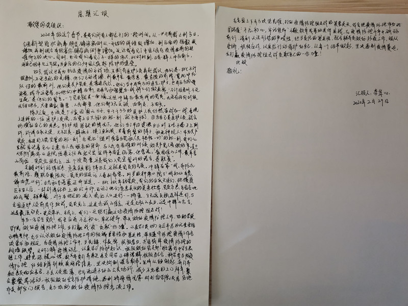 同学们通过“学习强国”等平台线上学习了相关讲话和重要文件精神,在坚持每天查看新闻和时事评论中,大家都会被“我是党员、我先上”的率先垂范的精神激励着,被无数“逆行者”的事迹所感动。大家见证了中国共产党的坚强领导,见证了我国社会主义制度的优越性,更加坚定了理论自信、制度自信。学生党员和入党积极分子们把自己亲历疫情的所思、所想、所感真实的手写了这份特殊的思想汇报递交给所在党支部。